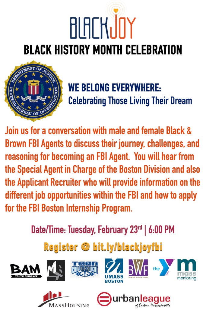 Good Morning,The BlackJoy Project and coalition of partners invites you to our first Black History Month celebration: “We Belong Everywhere: Celebrating those Living their Dream.” As we move through today’s health, economic, and structural racism pandemics, we believe it’s important to be leaders and active participants in every arena, especially law enforcement. We also believe it’s important to learn from and honor the history makers we don’t often see or read about and to expose opportunities and first person truths to our youth and community. Register here: bit.ly/blackjoyfbi
